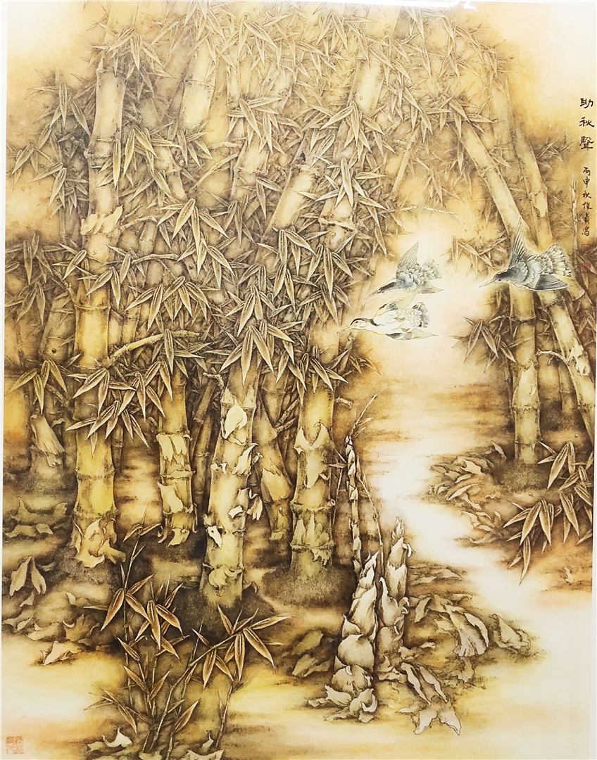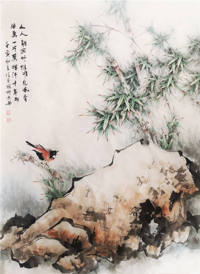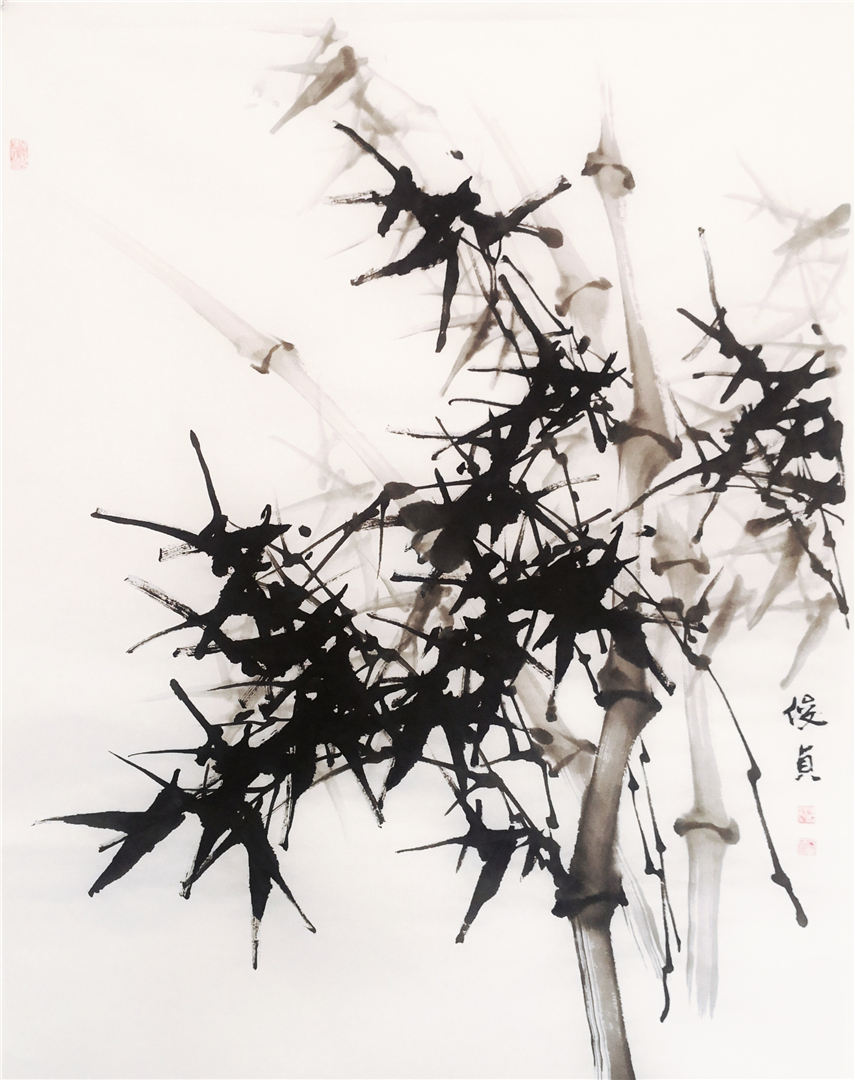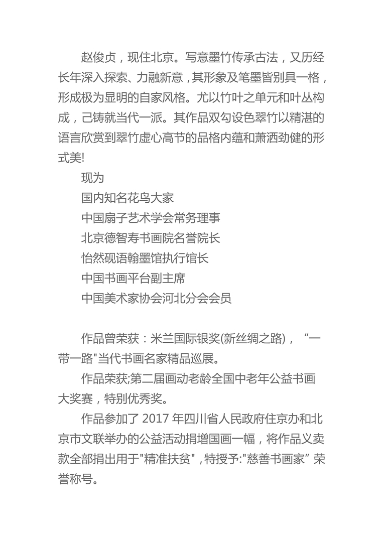 赵俊贞,现住北京。写意墨竹传承古法,又历经长年深入探索、力融新意,其形象及笔墨皆别具一格,形成极为显明的自家风格。尤以竹叶之单元和叶丛构成,己铸就当代一派。其作品双勾设色翠竹以精湛的语言欣赏到翠竹虚心高节的品格内蕴和萧洒劲健的形式美!
