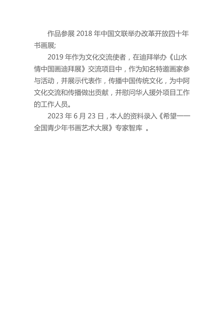 2019年作为文化交流使者,在迪拜举办《山水情中国画迪拜展》交流项目中,作为知名特邀画家参与活动,并展示代表作,传播中国传统文化,为中阿文化交流和传播做出贡献,并慰问华人援外项目工作的工作人员。